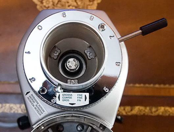 - → Die Mahlgradeinstellung muss nach rechts (gegen den Uhrzeigersinn, in Richtung „fine“) gedreht werden, um feiner zu mahlen.