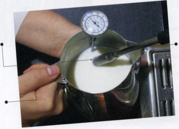 - Bevor die Milch in die Tasse gegossen wird, wird der Pitcher in kleinen Kreisen bewegt, damit sich Milch und Milchschaum verbinden.