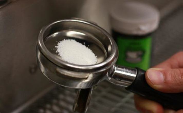 - Geben Sie 1 Teelöffel Espressomaschinen-Reiniger in das Blindfilter.